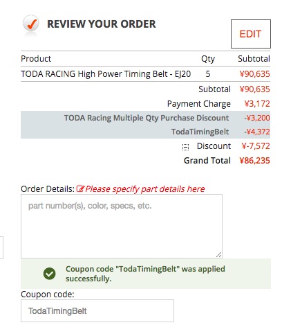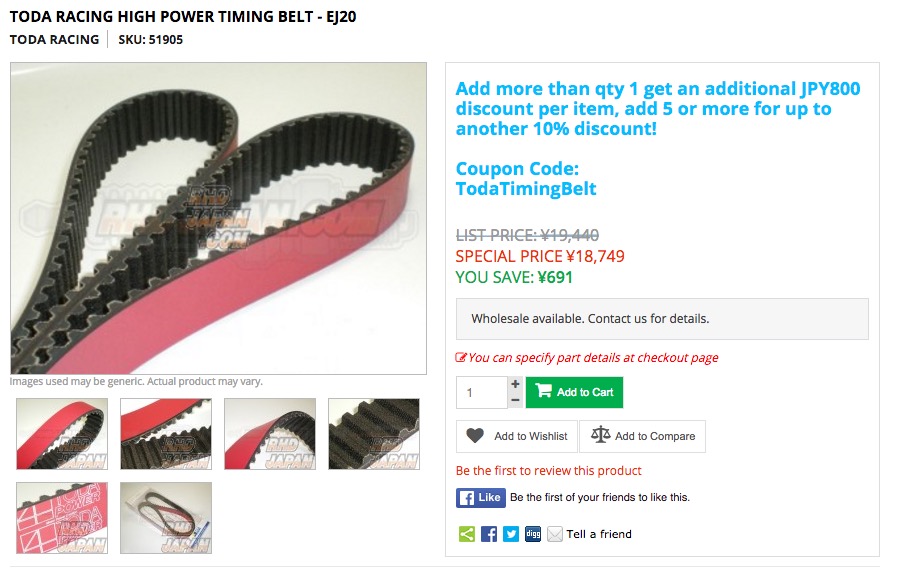 Welcome to the RHDJapan blog! Here is a great campaign to highlight some more great savings from RHDJapan. This campaign includes a couple different discounts which add up to be by far the best pricing available. As noted in the previous blogs we now automatically apply discounts when purchasing more than one item from select brands. TODA Racing is one example in which we provide a JPY800 discount per each item over Qty1 purchased.
