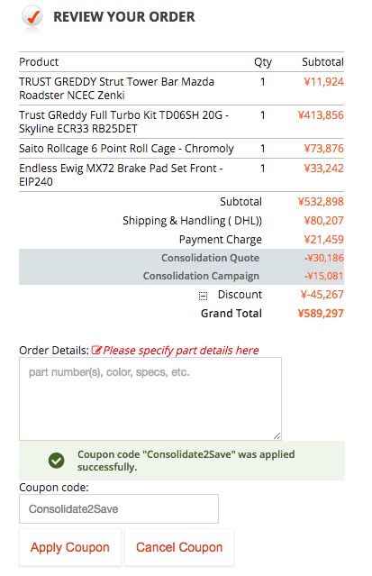 Welcome to the RHDJapan blog. This post will be introducing a new kind of campaign which will provide even more incentive to take advantage of the consolidation of products. Select categories throughout the site will qualify for a discount and the same discount will be applied to anything else purchased at the same time!